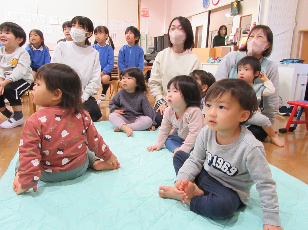 今月の出し物はまず最初に「12干支のはじまり」の絵本の読み聞かせがありました。新年にそなえてみんなで干支をおぼえましたよ😊