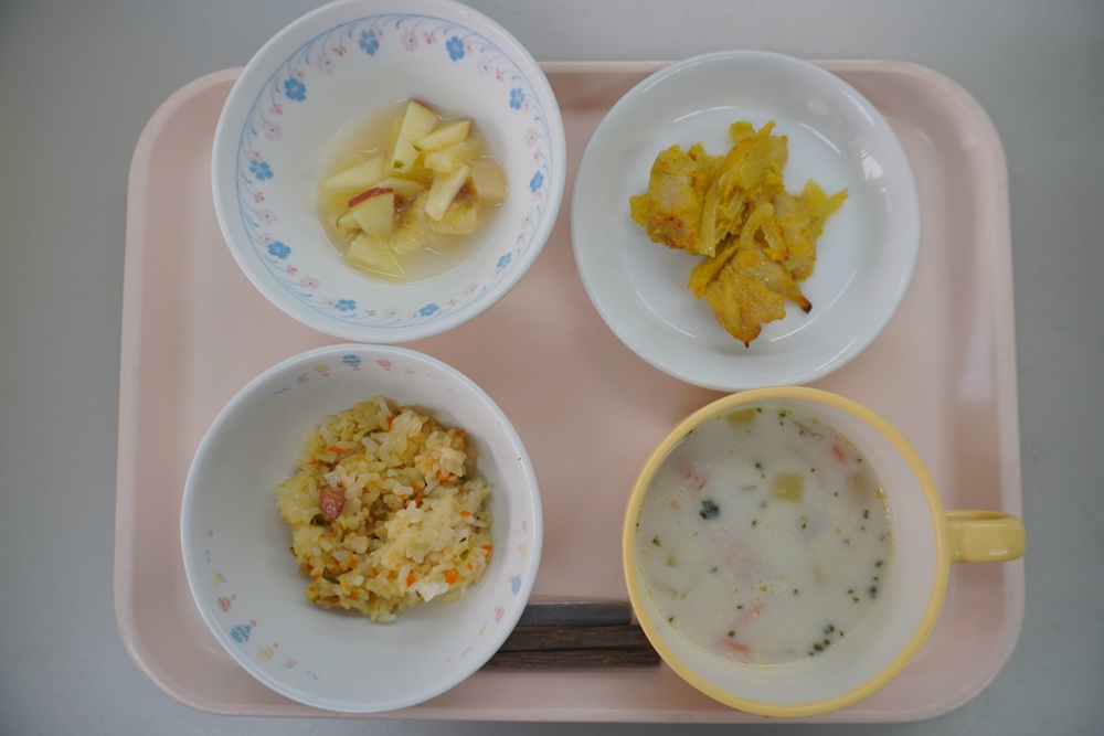 今月のお誕生日のお給食は、『カレーピラフ、タンドリーチキン、ミルクスープ、フルーツポンチ』でした。